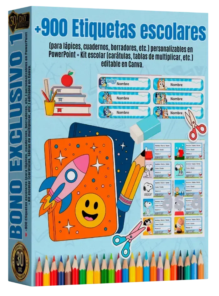 💗 +900 Etiquetas escolares (para lápices, cuadernos, borradores, etc.) personalizables en PowerPoint + Kit escolar (carátulas, tablas de multiplicar, etc.) editable en Canva.