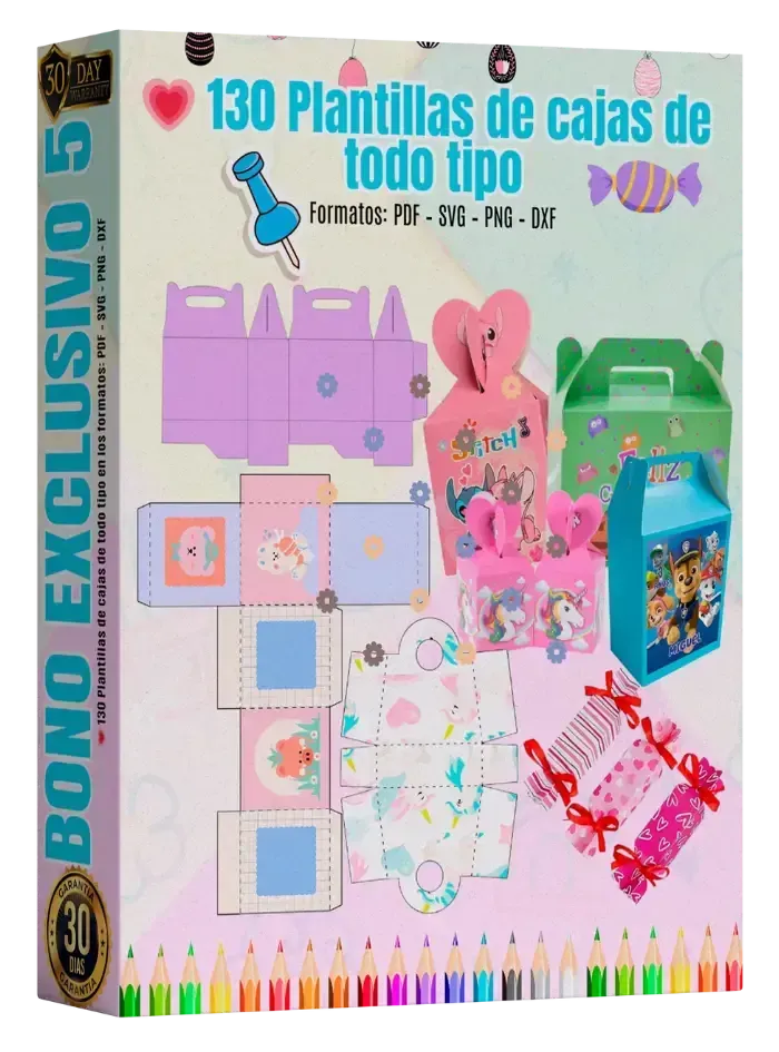 Incluye todos estos modelos de cajitas y más (chipbags, banderines, porta vasos, centro de mesa, cierra bolsas, rompecabezas, etc).
