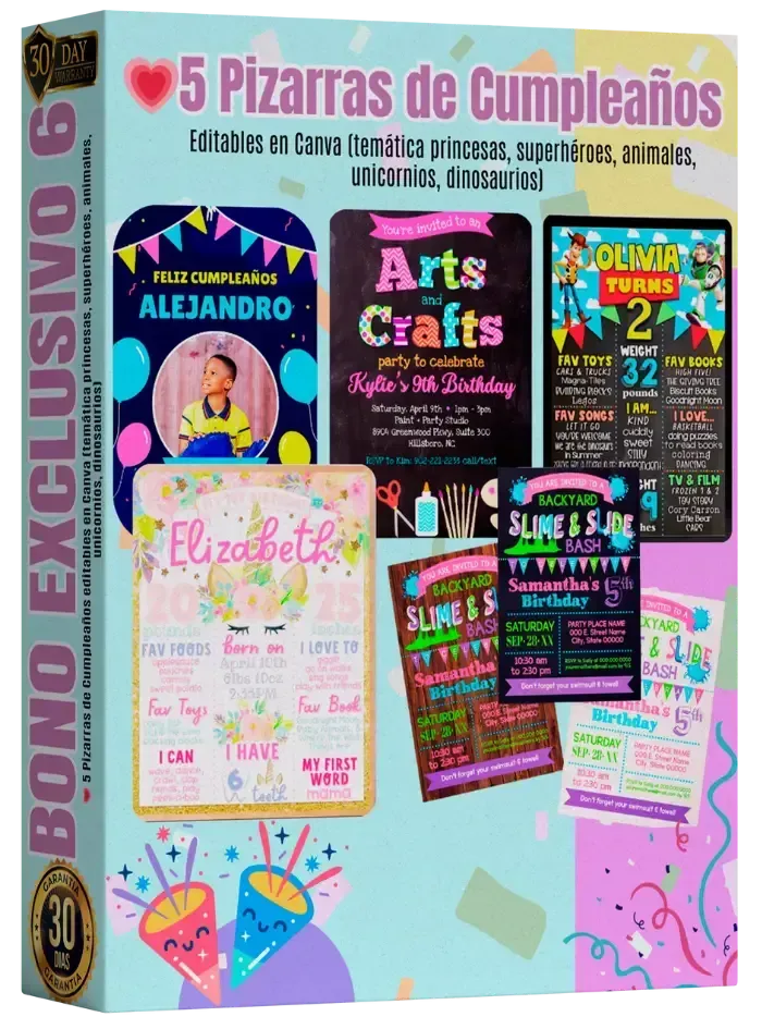 💗 5 Pizarras de Cumpleaños editables en Canva (temática princesas, superhéroes, animales, unicornios, dinosaurios)